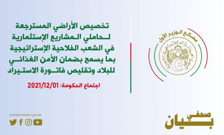 وفي ذات السياق ألح الوزير الأول على ضرورة تخصيص الأراضي المسترجعة لحاملي الـمشاريع الإستثمارية في الشعب الفلاحية الإستراتيجية، وذلك بما يسمح بضمان الإستقلال الغذائي للبلاد وتقليص فاتورة الاستيراد، خصوصا الحبوب.