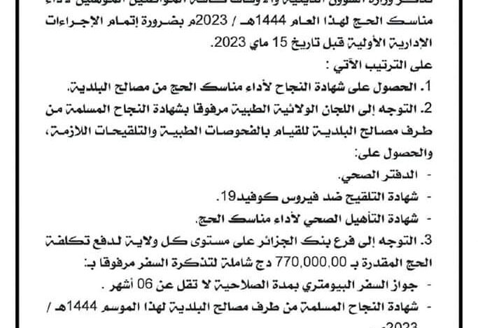 تذكر وزارة الشؤون الدينية والأوقاف كافة المواطنين المؤهلين لأداء مناسك الحج لهذا العام 1444هـ / 2023م بضرورة إتمام الإجراءات الإدارية الأولية قبل تاريخ 15 ماي 2023.